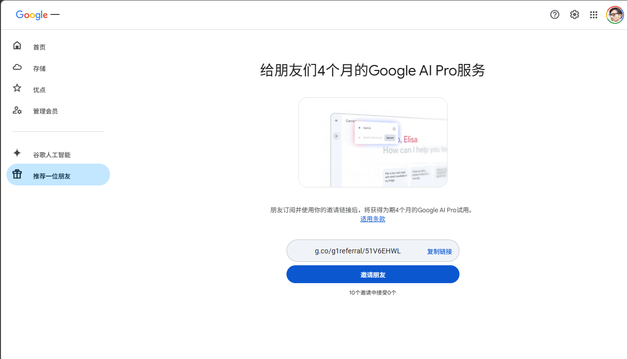 这四个月的免费会员,其实是利用了谷歌的“老带新”活动:通过老用户的邀请链接,新账号可以免费开通4个月的 Pro 套餐。