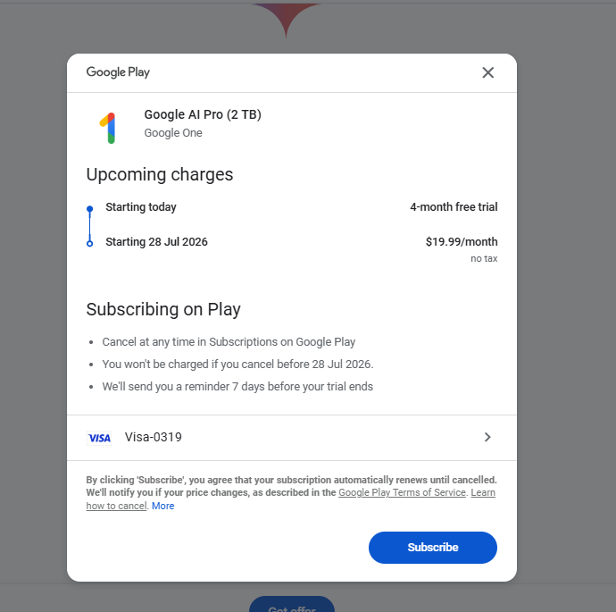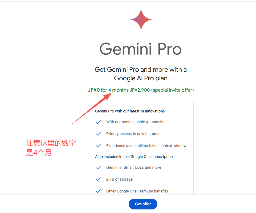 1️⃣ 注册并登录好新的谷歌账号后,将刚才复制的邀请链接粘贴到浏览器中打开,此时页面就会弹出四个月免费试用的提示界面。核对试用月份显示为“4个月”无误后,我们点击蓝色的 【Get offer】 按钮。