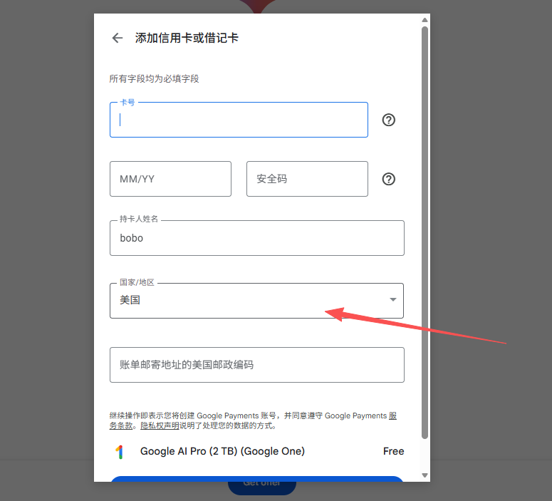 🚨 核心操作警告:获取到卡片信息后,依次填入即可。国家/地区请选择美国,邮编填写任意一个美国的免税州邮编。