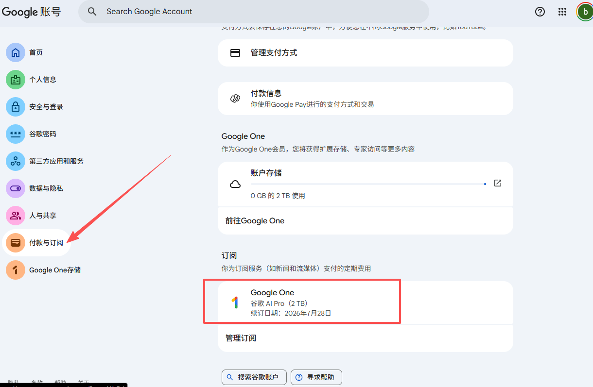 依次点击网页右上角的 头像 -> 管理我的谷歌账号 -> 付款与订阅,即可清晰地查看到套餐的到期时间。