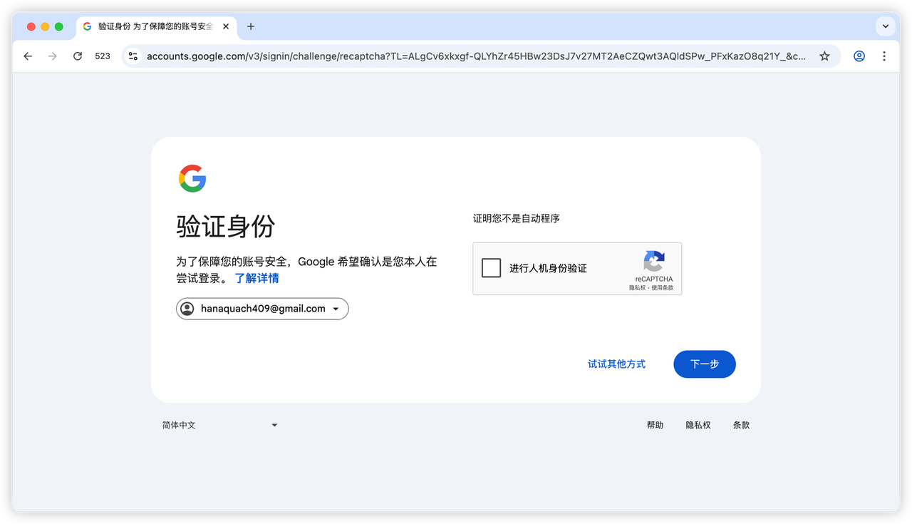 在登录的时候有可能遇到一次人机验证,先是要你处理一个验证码,下图中 点击进行人机身份验证。