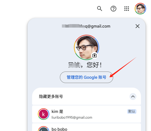 - 登录好之后,点击右上角头像,点击“管理我的谷歌账户”。