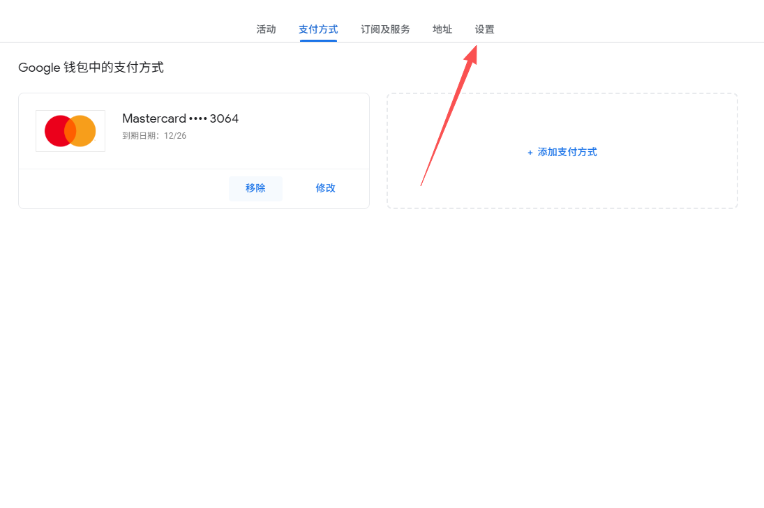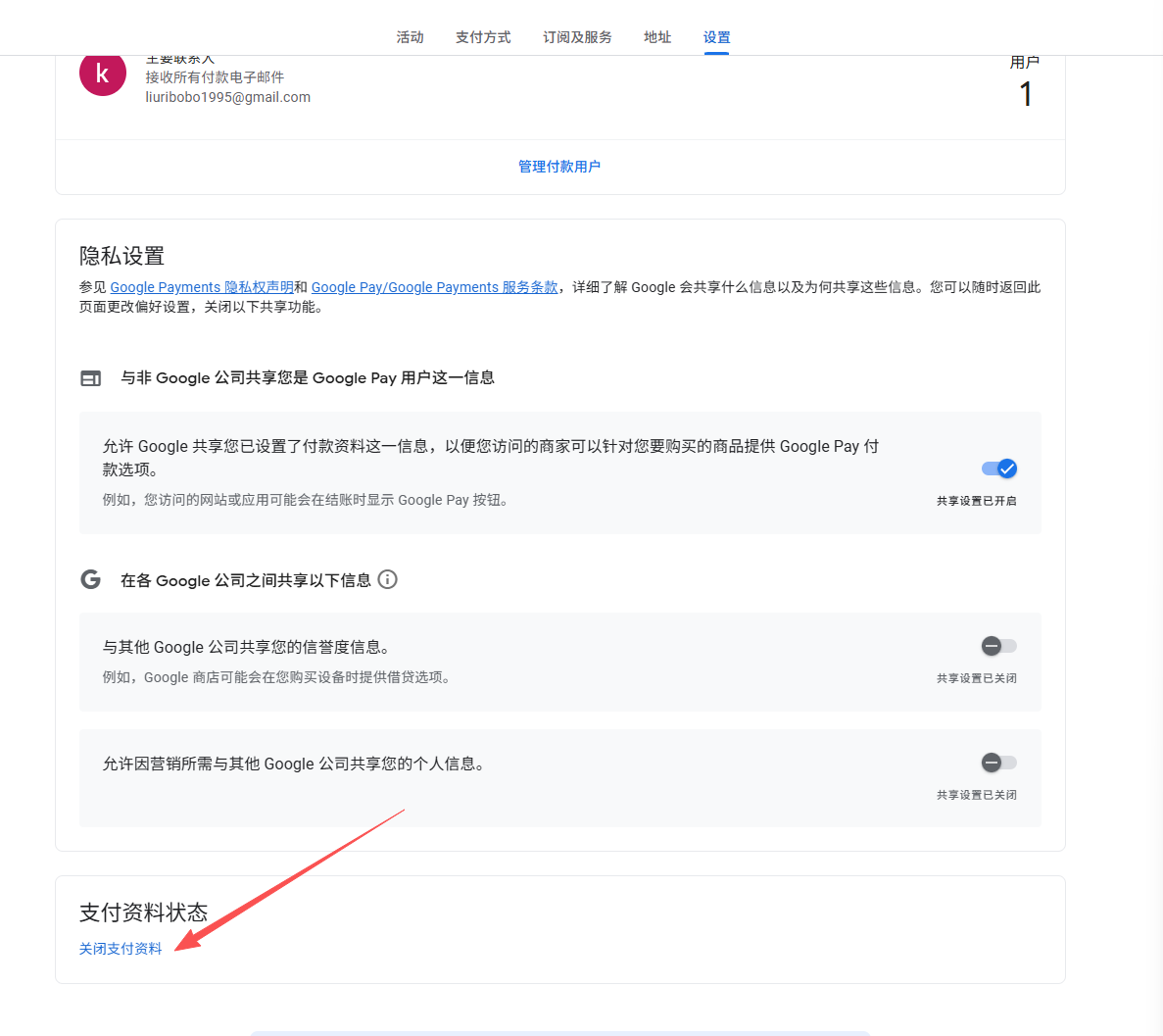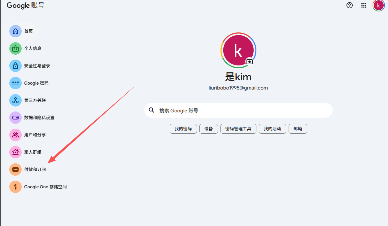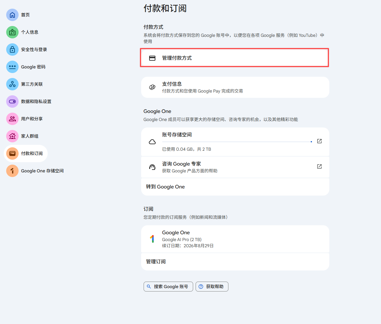 - 💳 进入管理谷歌后台页面,点击【付款与订阅】,再点击管理付款方式。