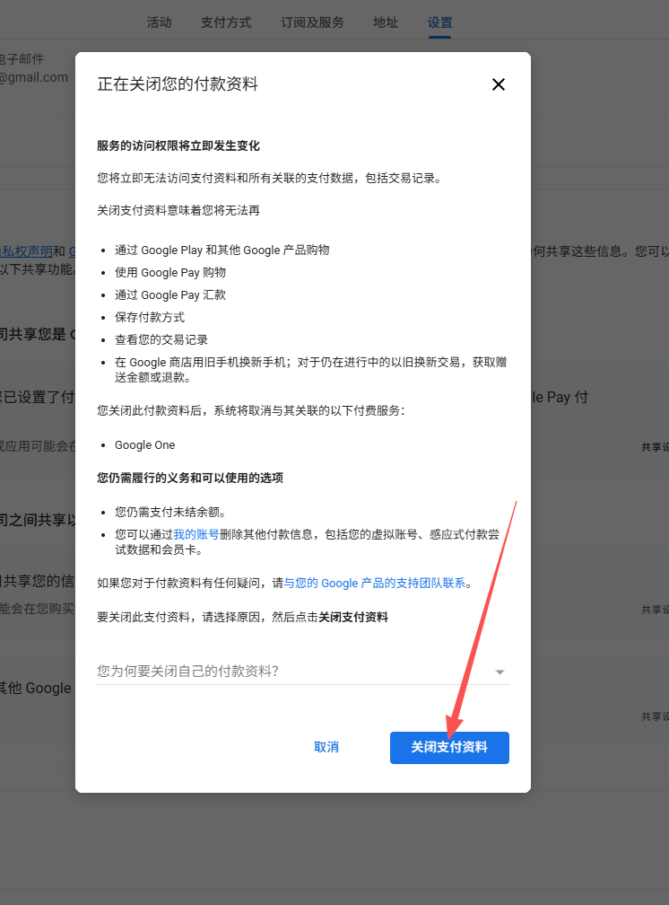 - ⚙️ 进入到设置之后,一直向下滑动页面,滑倒底部即可看到关闭支付资料的蓝字,我们点击【关闭支付资料】,随后会弹出一个窗口,我们随便选一个原因之后,点击【关闭支付资料】。