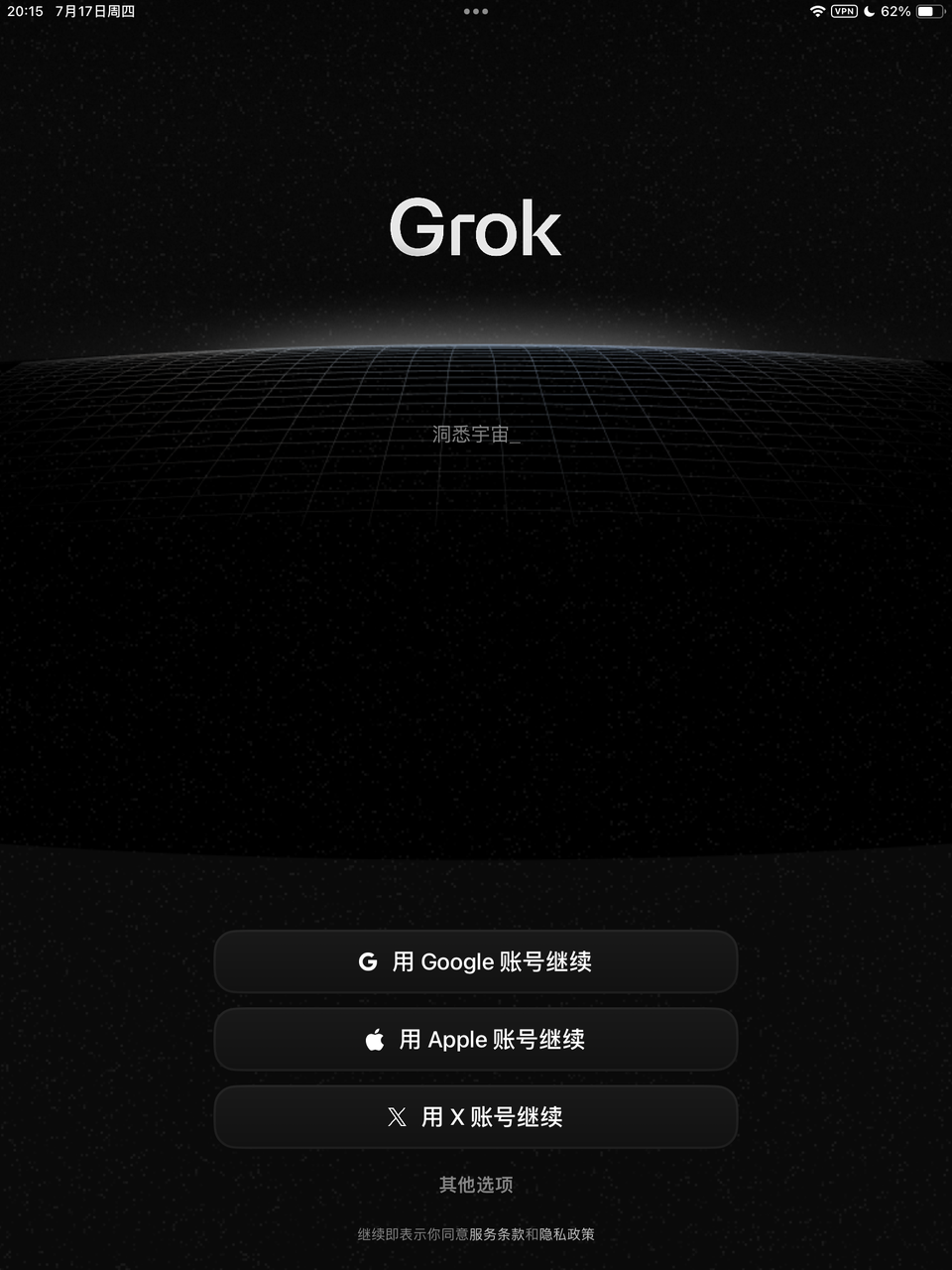 打开grok之后,有三个选项,建议大家直接选择苹果账号就行,选谷歌有几率报错登不进。