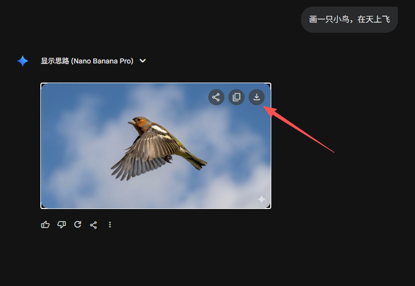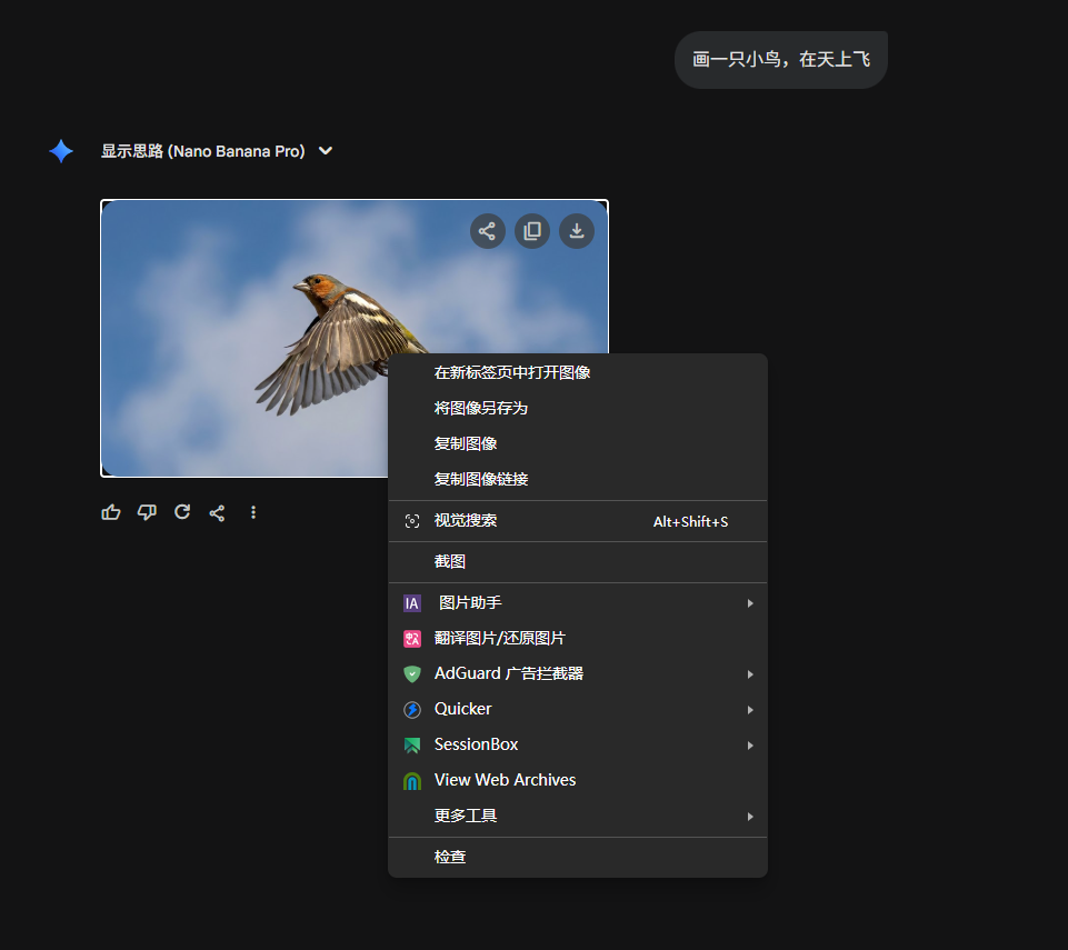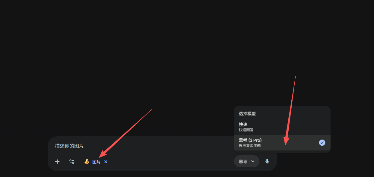 如果选择的是快速(Flash)模式,则是 Nanobanana 初代模型。 请记得先选择好图片,然后再选择“思考”,这才是 Pro 模型。