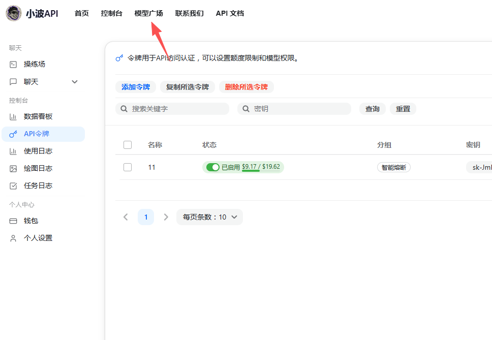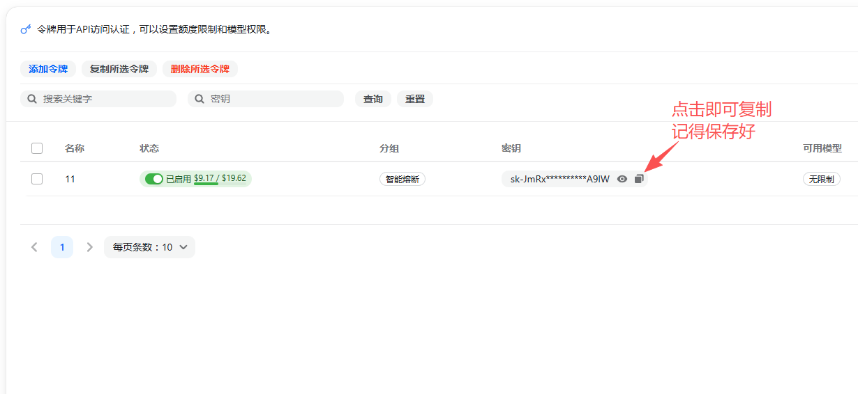 - 开始使用:充值完成后,即可复制令牌密钥,前往站点使用。