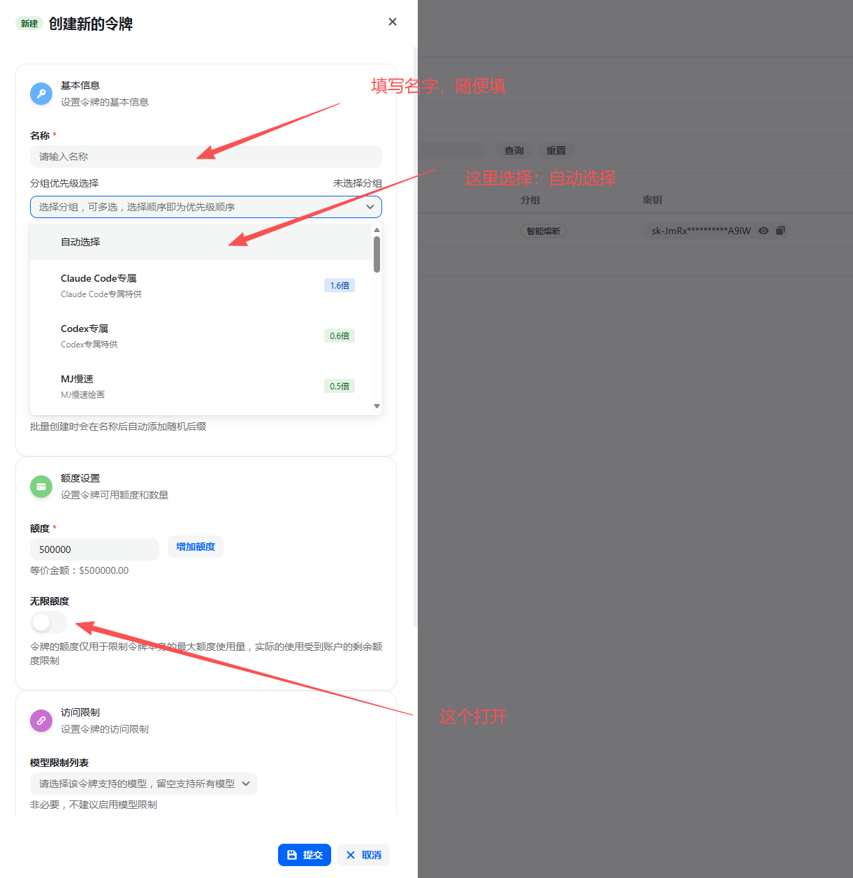- 填写令牌信息:名称随意填,分组一般选择【auto】即可,额度一般选择无限额度。